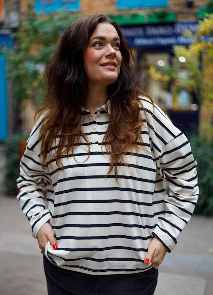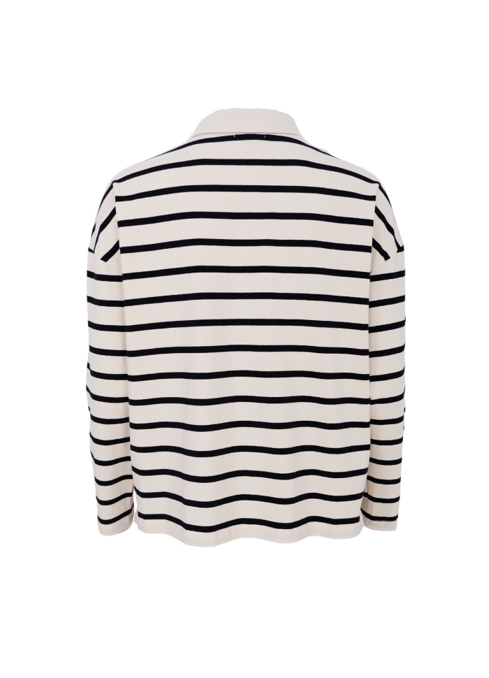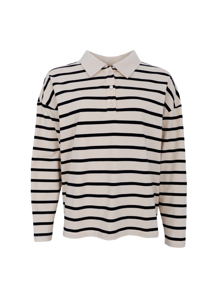 Skøn polo-bluse med striber fra Black Colour i en lækker bomuldskvalitet. Blusen har en regular pasform og stolpelukning med similisten.