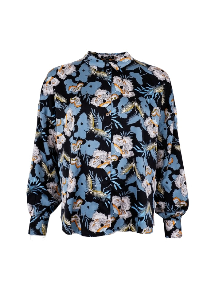 Skøn bluse fra Black Colour i et farverigt blåt print. Blusen har en oversize pasform og lukkes med knapper hele vejen ned.