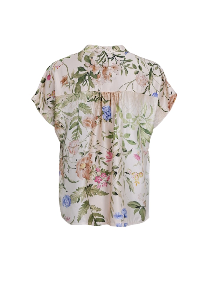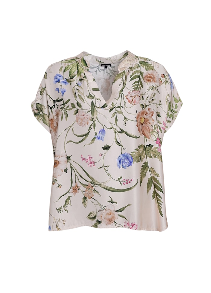 Smuk bluse i en skøn viskosekvalitet der ligner satin fra Black Colour. Blusen har en løs pasform og er i et smukt blomsterprint.
