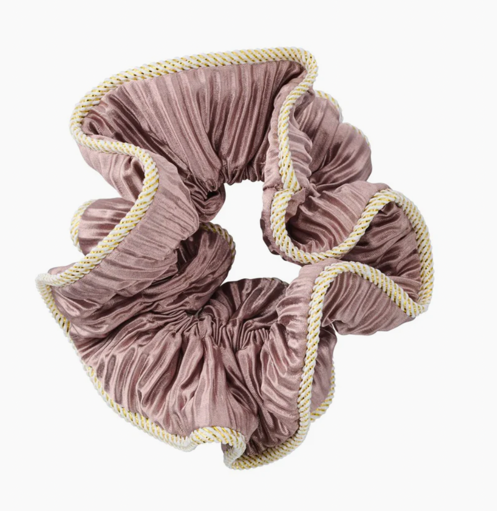 Dette Lilje Scrunchie Hårelastik er syet på en ny måde, således der er to lag med en “krøllet” effekt og en diskret glimmersnor rundt i kanterne.