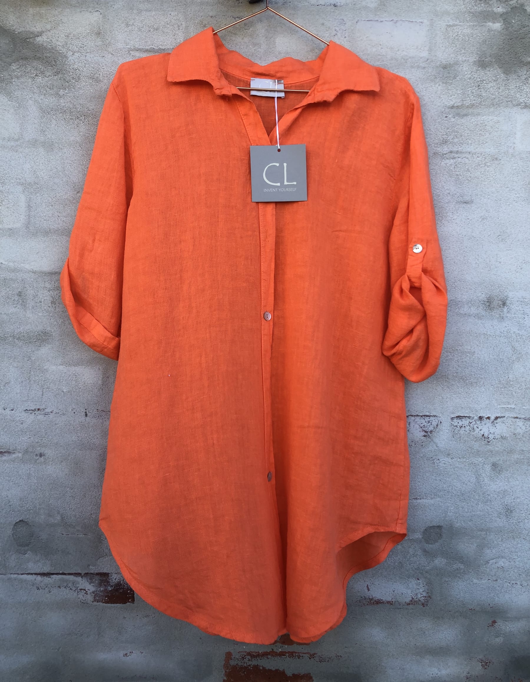 Oversize bluse fra Cabana Living i den fineste orange farve. Blusen er gennemknappet, har krave og med 3/4 ærmer inklusiv opsmøg.