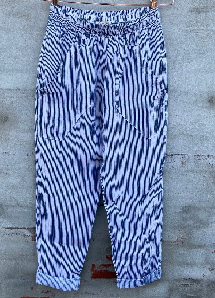 Bukser i hør fra Cabana Living med printet striber i blå og hvid. Buksen har elastikkant i taljen og to forlommer.