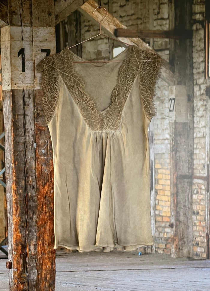 Top i vasket viskose med bred blonde ved hals-