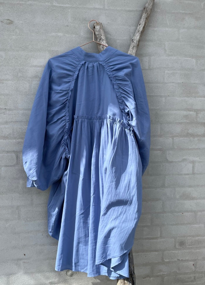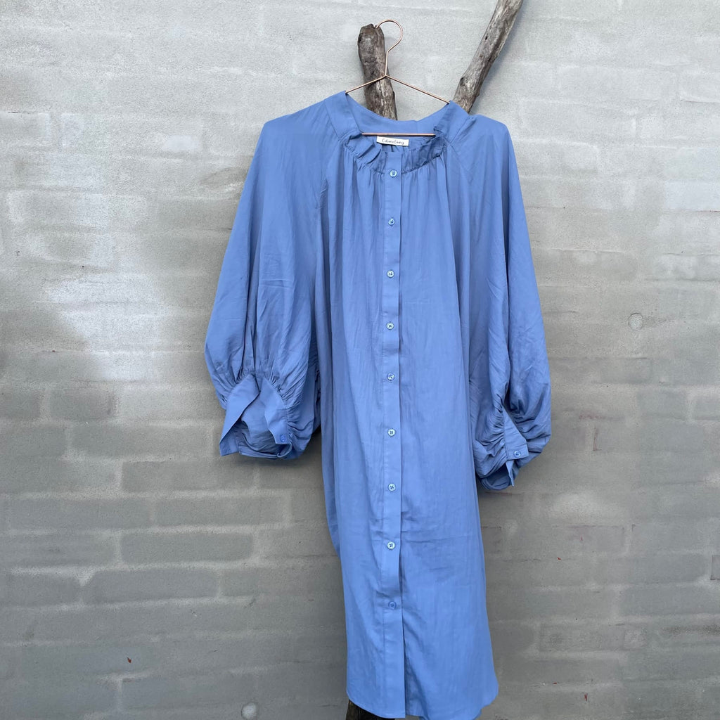 Super cool oversize skjortekjole fra Cabana Living. Skjortekjolen er med høj hals, ballonærmer raglan ærmer. Derudover de flotteste flæsedetaljer på ryggen.