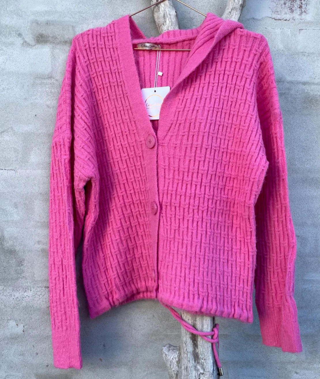 Lækker strik i pink fra Cabana Living. Strikken er gennemknappet med tre store knapper foran med bindebånd nederst. Strikken har hætte og v-udskæring. Derudover har den lange ærmer og detaljer i det flotteste mønster.