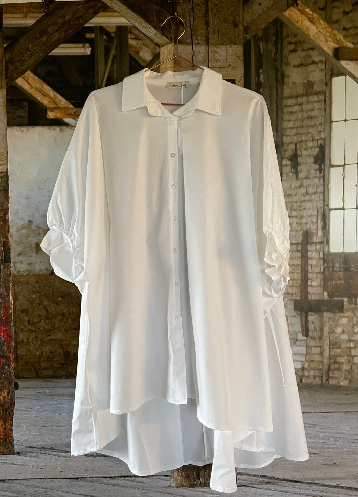 Oversize simpel skjorte fra Cabana Living i hvid. Skjorten har krave, korte ærmer og er gennemknappet. Derudover længere bagtil.