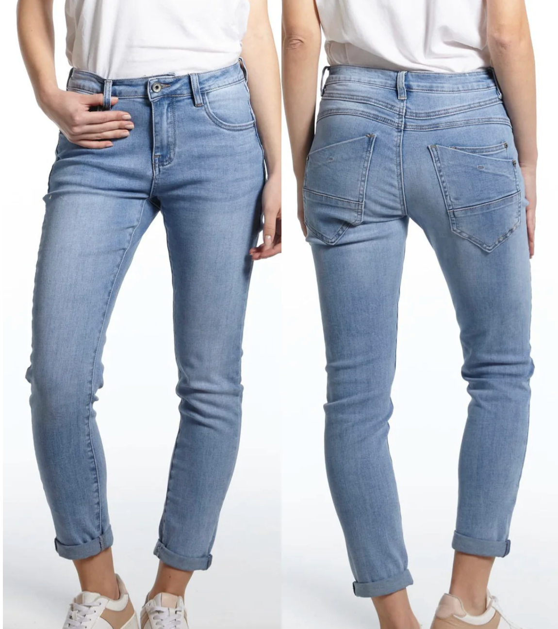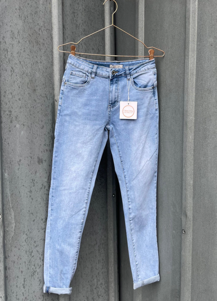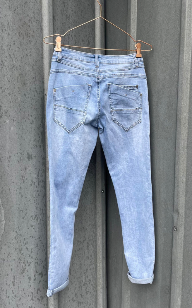 Cool fitted jeans fra Cabana Living i en skøn lys denimvask. Jeansene har fede asymetriske baglommer og saddleback der giver en perfekt pasform.