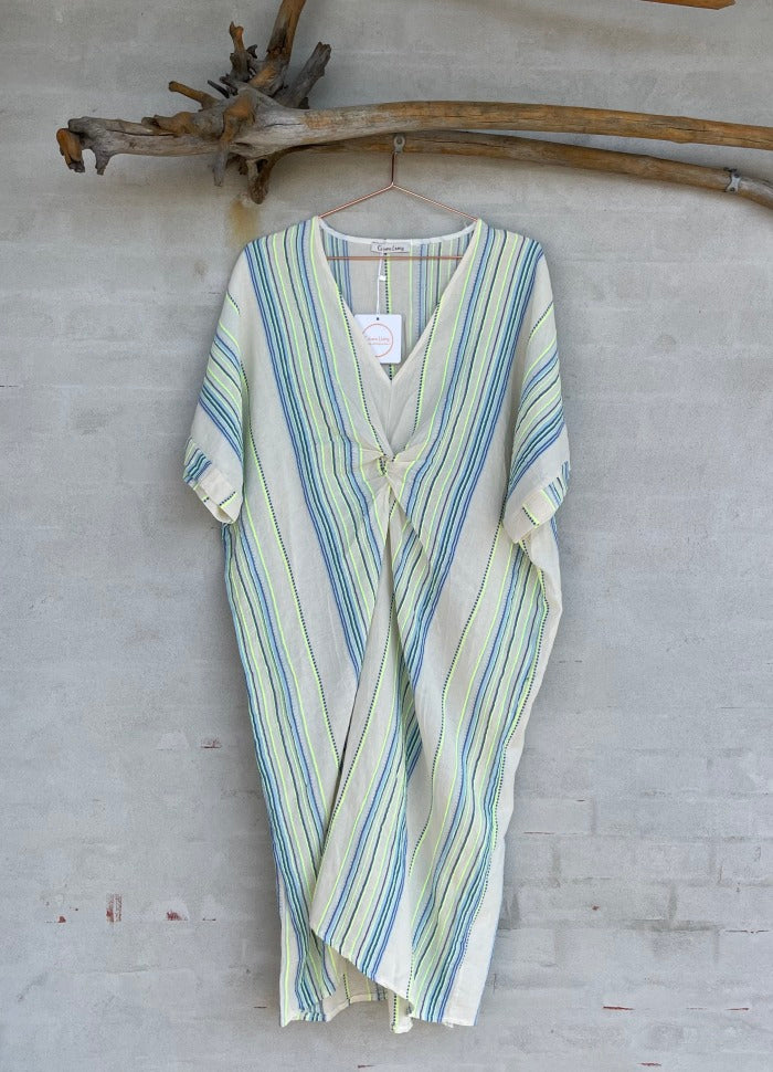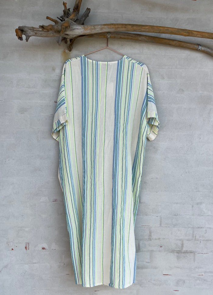 Oversize kjole med bindeeffekt på brystet. Flot metervare med vævede striber.