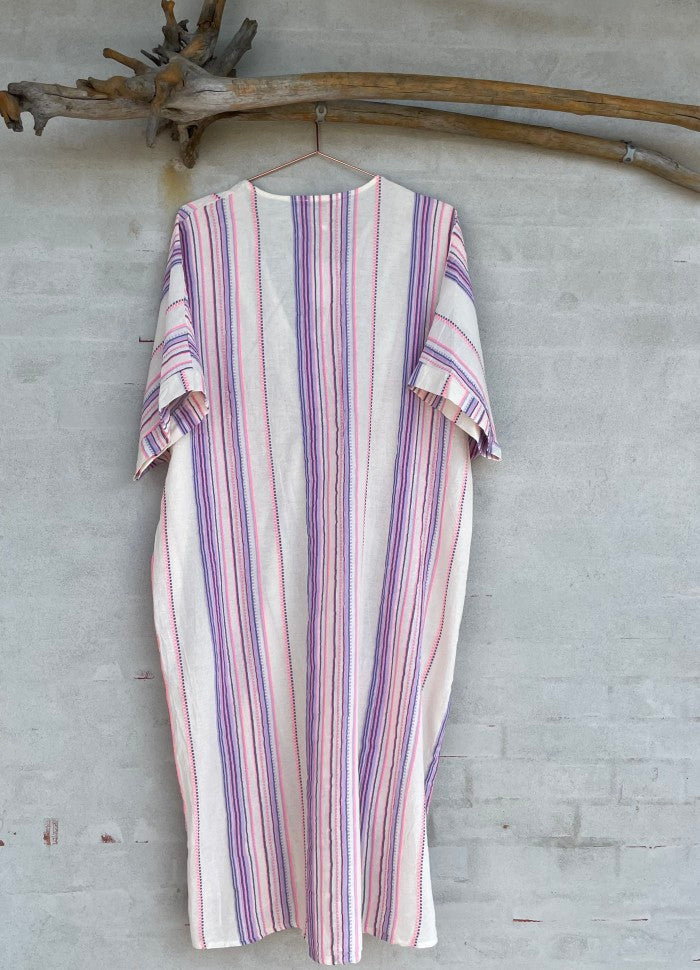 Oversize kjole med bindeeffekt på brystet. Flot metervare med vævede striber.