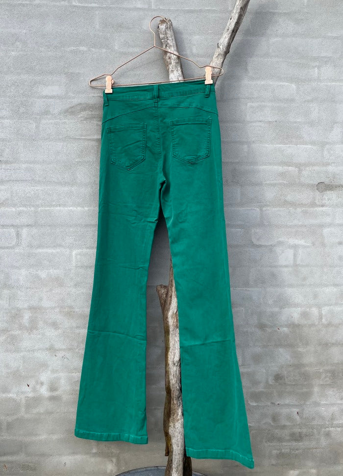 Cool jeans fra Cabana Living i en flot grøn farve. Buksen har høj talje og flare i benene.