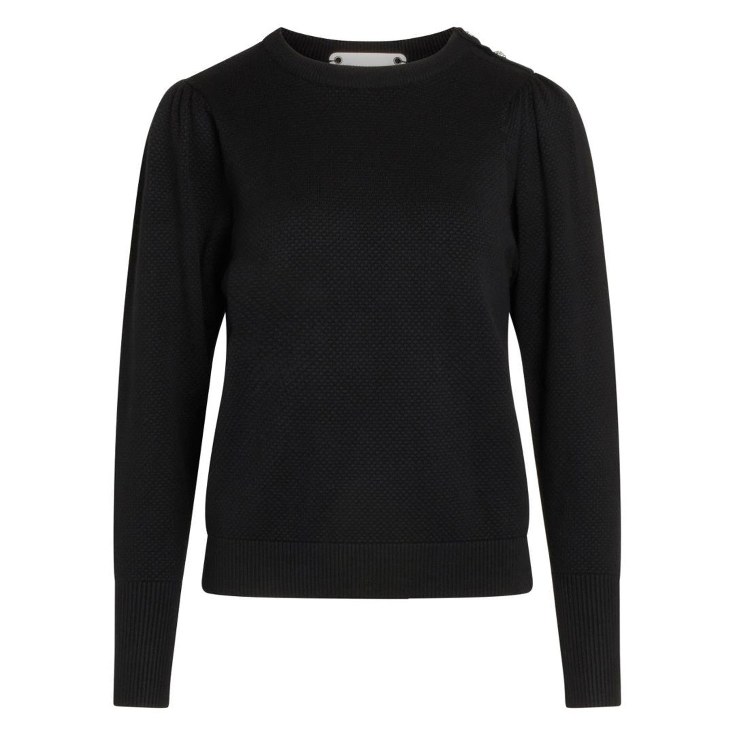 Skøn klassisk strik fra Co´Couture i sort. Strikken har lette puffærmer, rund halsudskæring og små knapper med similisten på venstre skulder. En enkel strik med flotte detaljer.
