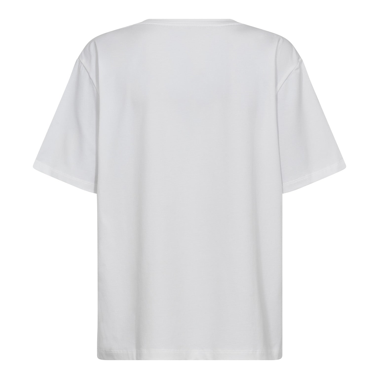 Coco Chic Box Tee er en klassisk, hvid t‑shirt i farven White 4000, lavet af 95% bomuld og 5% elastan, hvilket gør den blød, behagelig og let stretchy. Den har en moderne boxy/oversize pasform med rette snit, rund halsudskæring og korte ærmer, hvilket giver et afslappet og stilrent look. Den minimalistiske og tidløse stil gør t‑shirten alsidig og nem at style til både hverdag og mere casual pænere outfits.