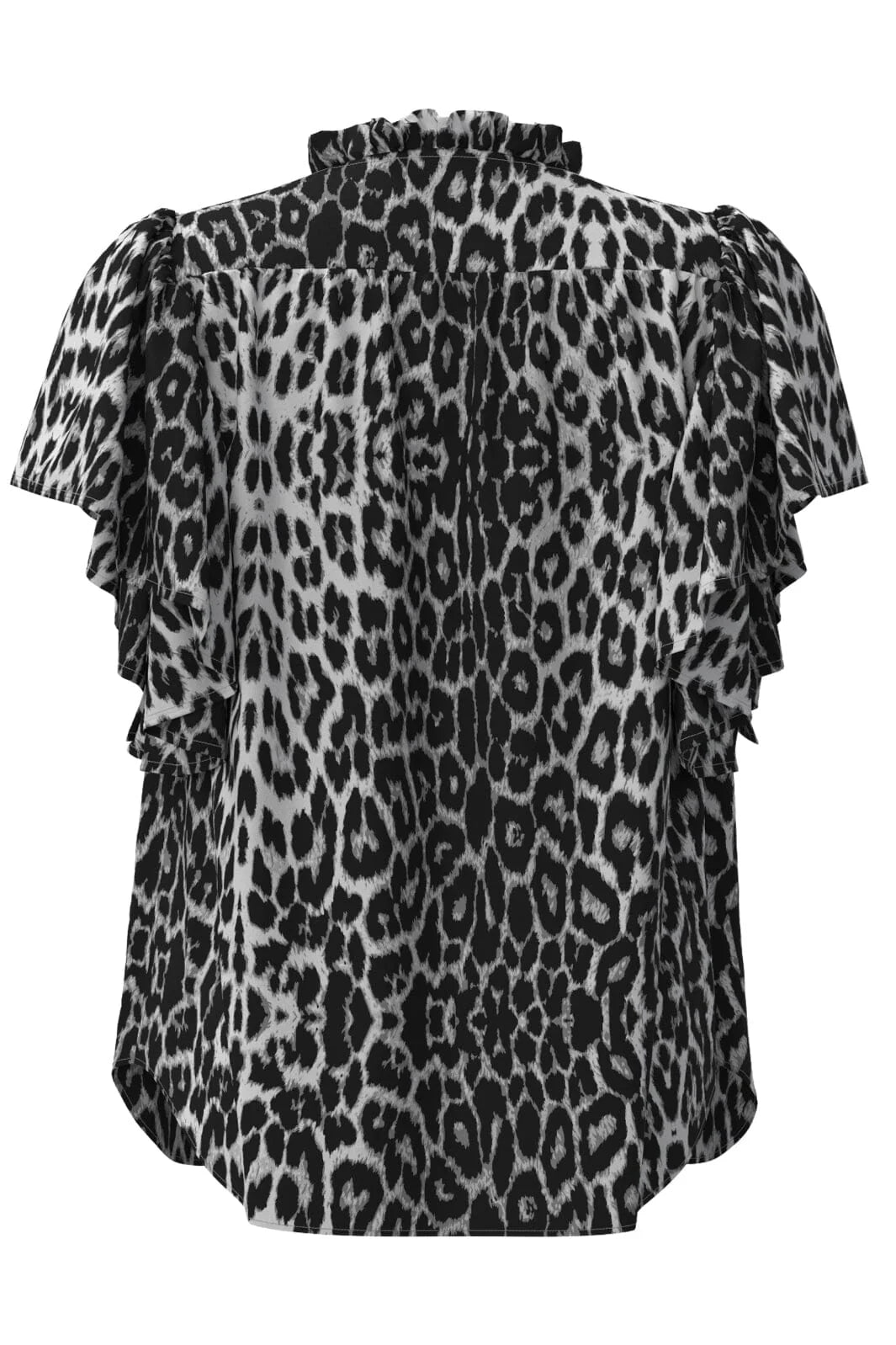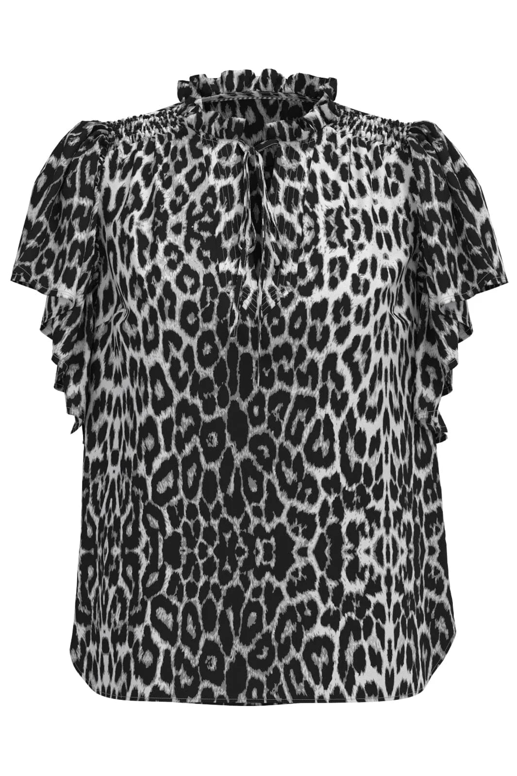 Fineste bluse fra Co´Couture i ren naturmateriale. Blusen er i mørkegrå leopardprint med feminin bindedetalje fortil og diskrete flæsedetaljer.