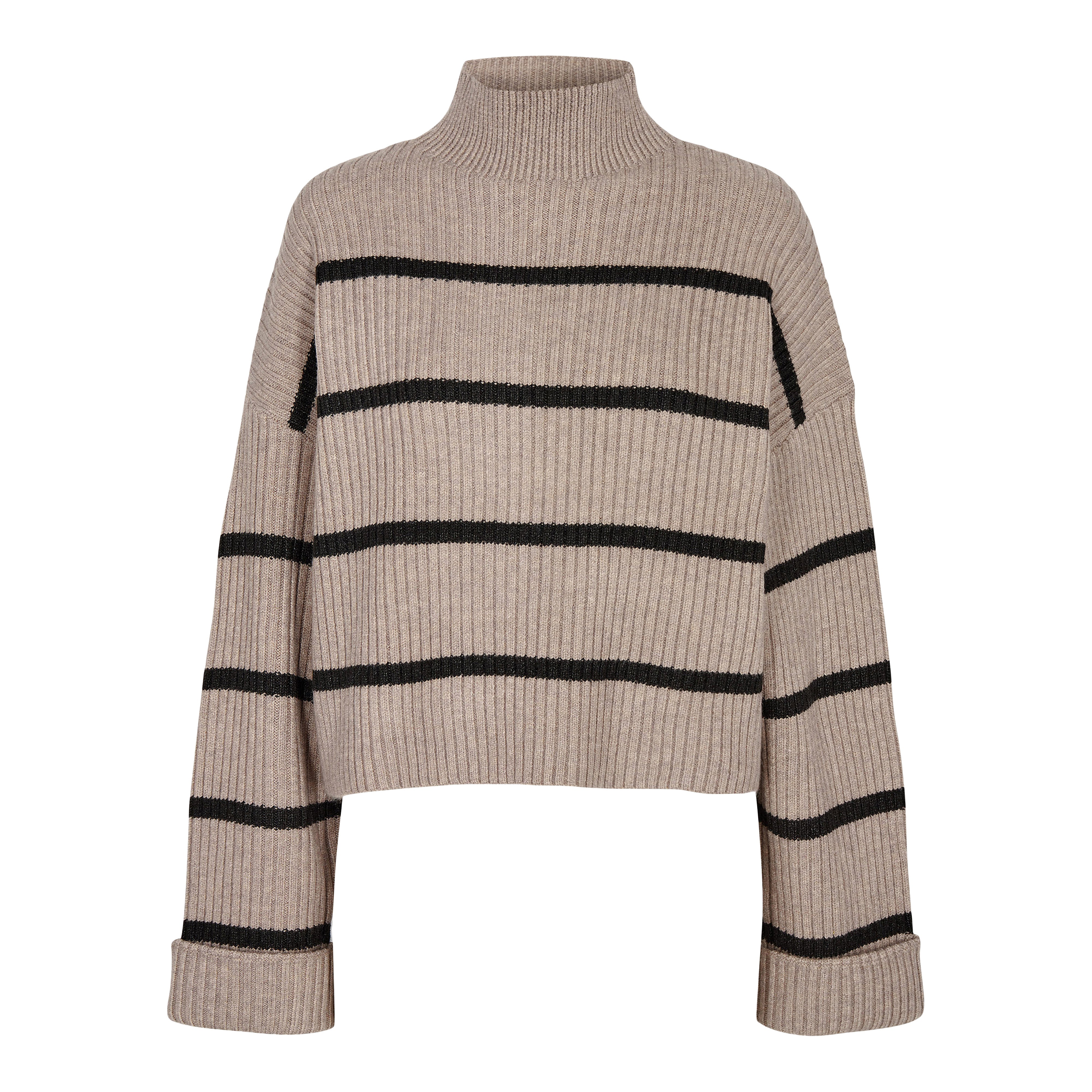 Lækker blød strik fra Co´Couture. Strikken er kort med bred pasform og lange ærmer. I en skøn sandfare med sorte vandrette striber.