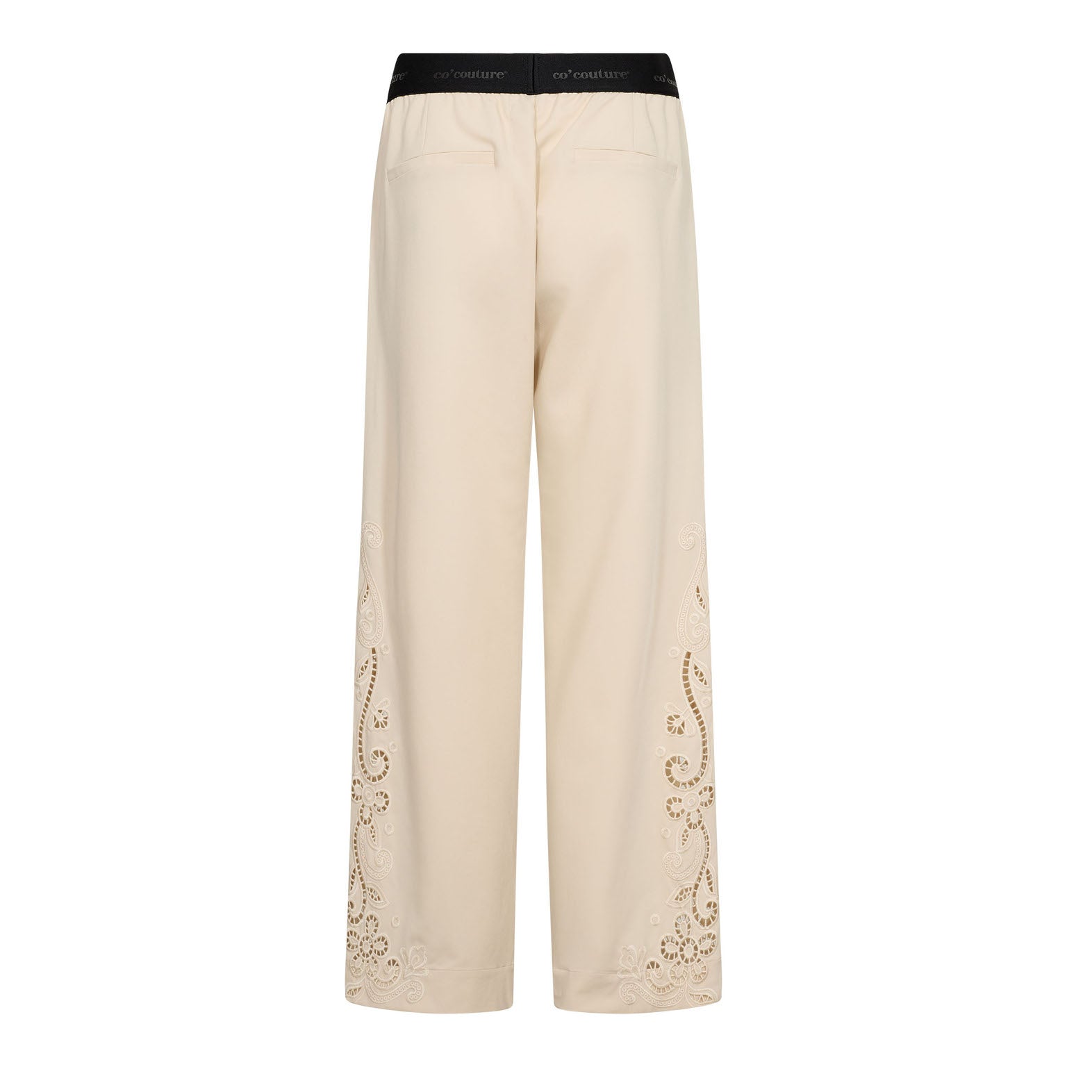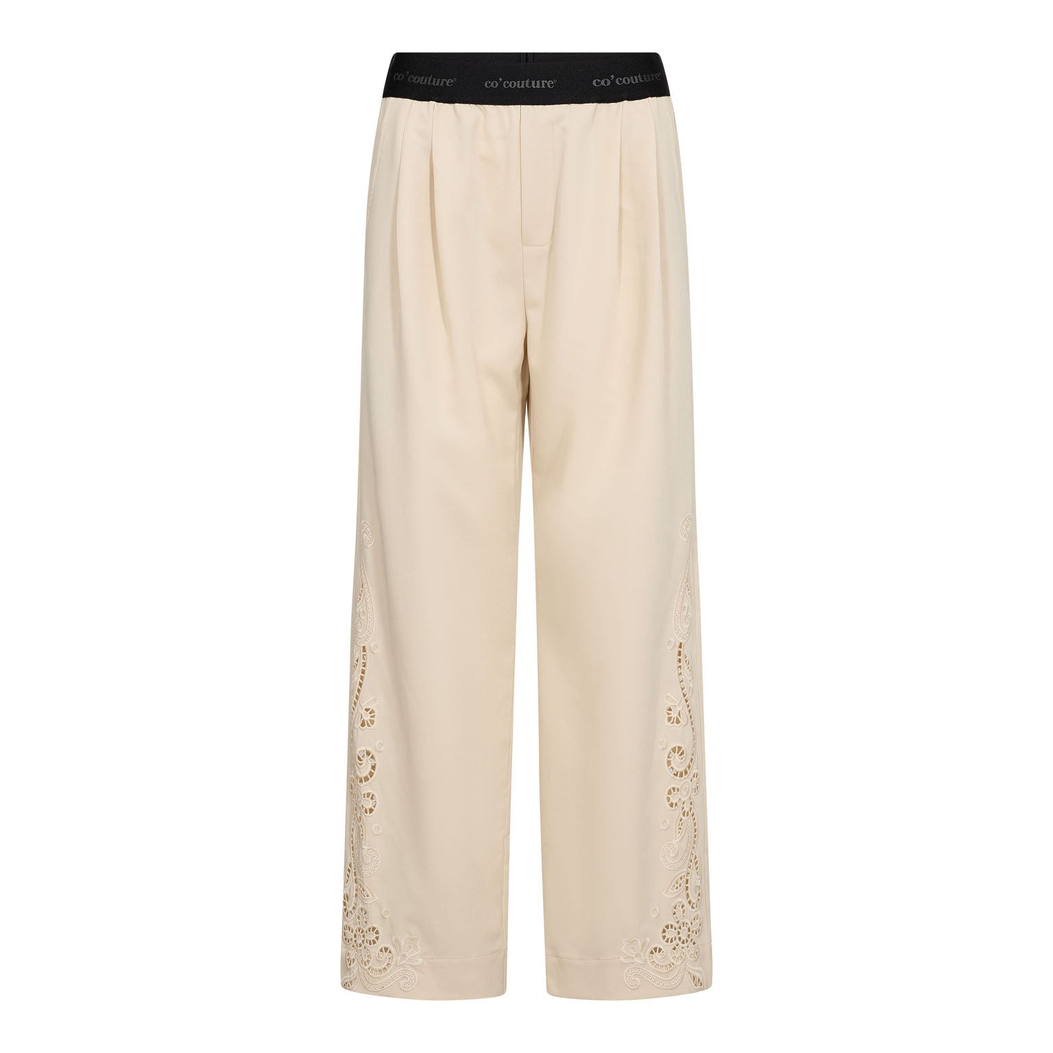Et centralt designelement er det diskrete logo-embroidery fra Co’ Couture, som tilfører et eksklusivt og genkendeligt touch uden at være for dominerende. Bukserne har en komfortabel pasform med elastik i taljen og mulig justering, der sikrer bevægelsesfrihed og en behagelig følelse gennem hele dagen.
