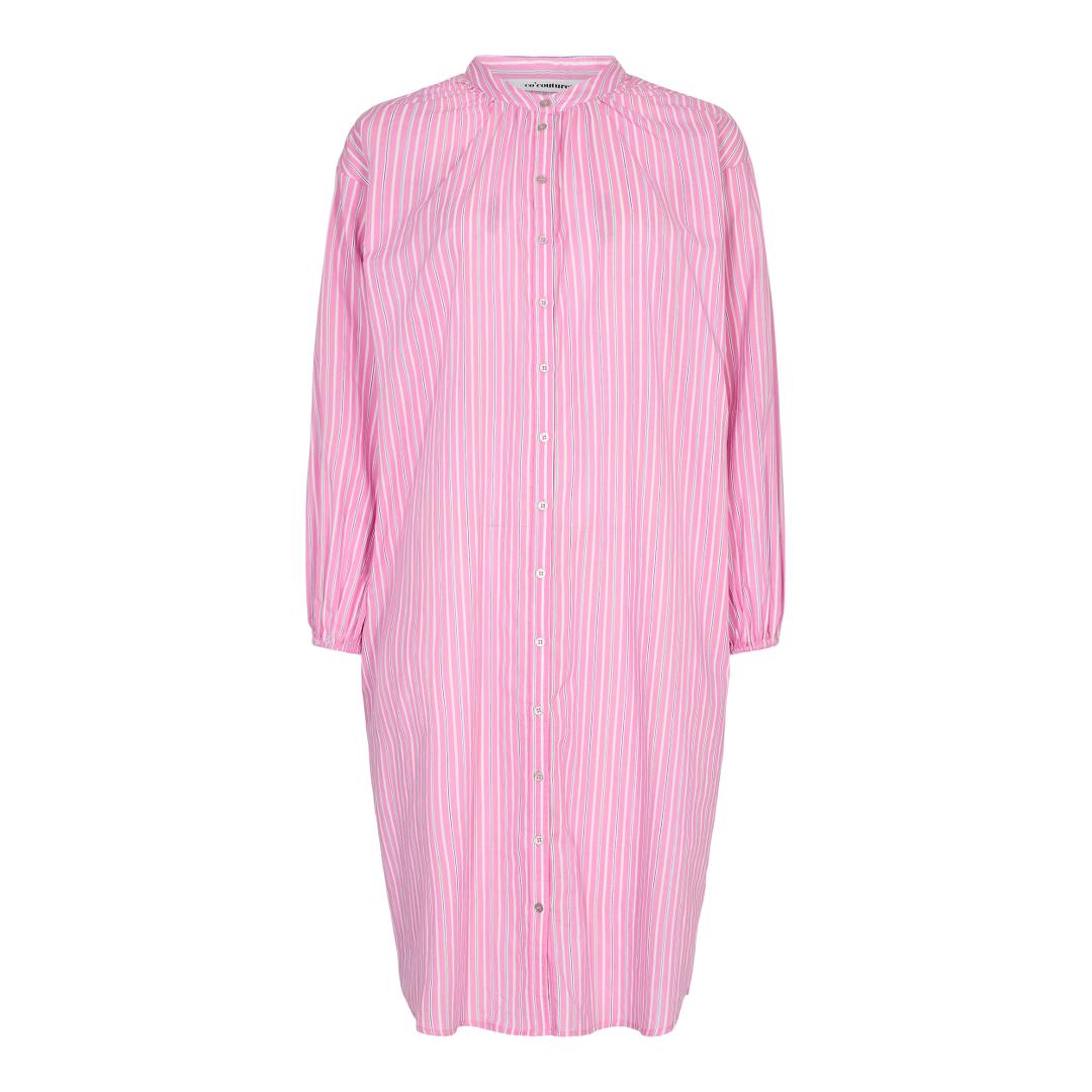 Pink kjole fra Co'Couture med hvide striber. Kjolen har lange ærmer med elastikkant og er gennemknappet.