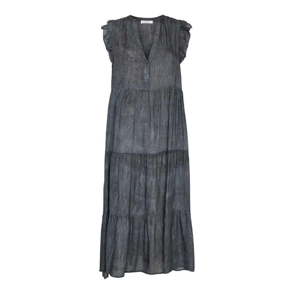 Skøn kjole i vasket grå fra Co' Couture. Kjolen har v-udskæring og stolpelukning. Den er ærmeløs og har fine flæser over skulderen. Kjolen går til anklerne.