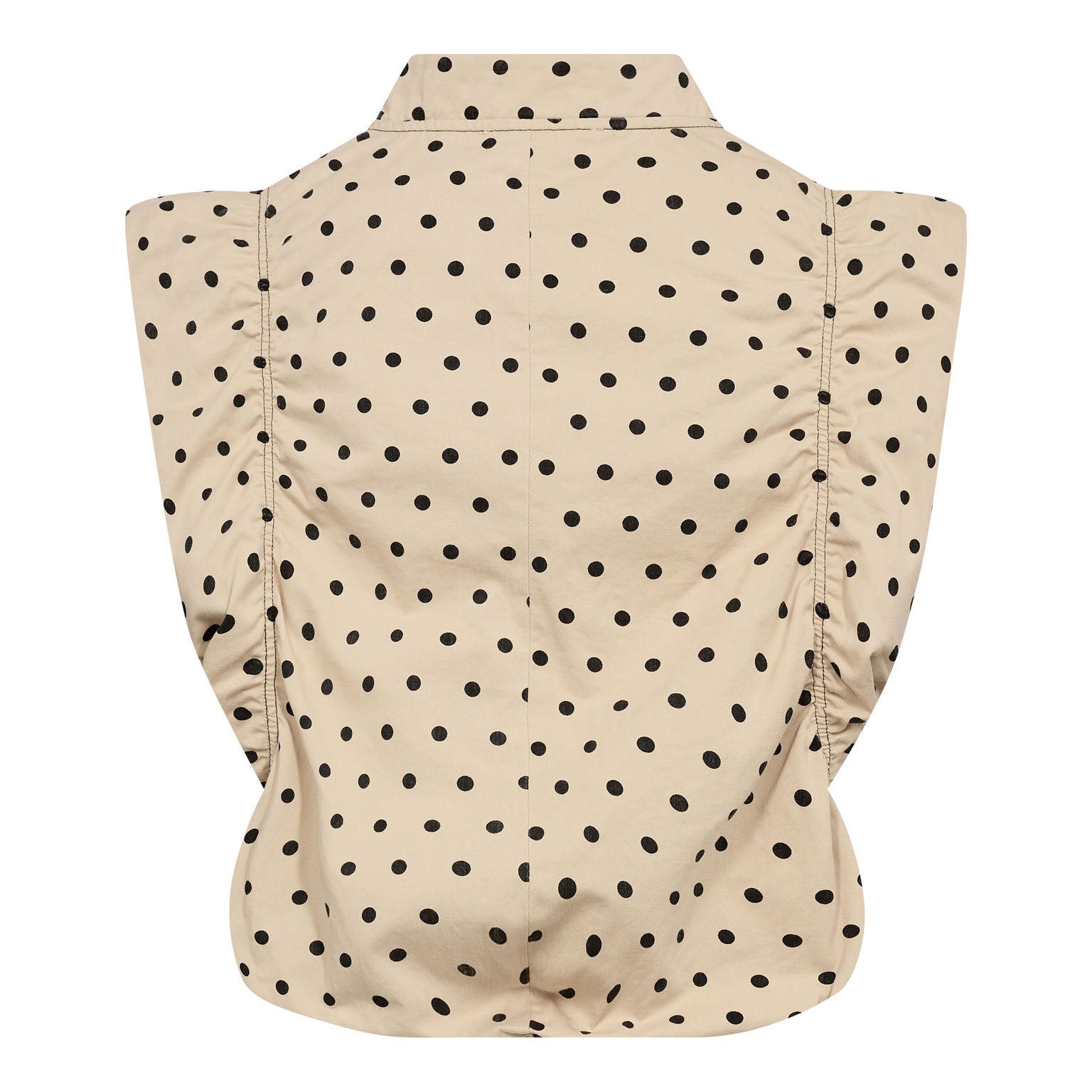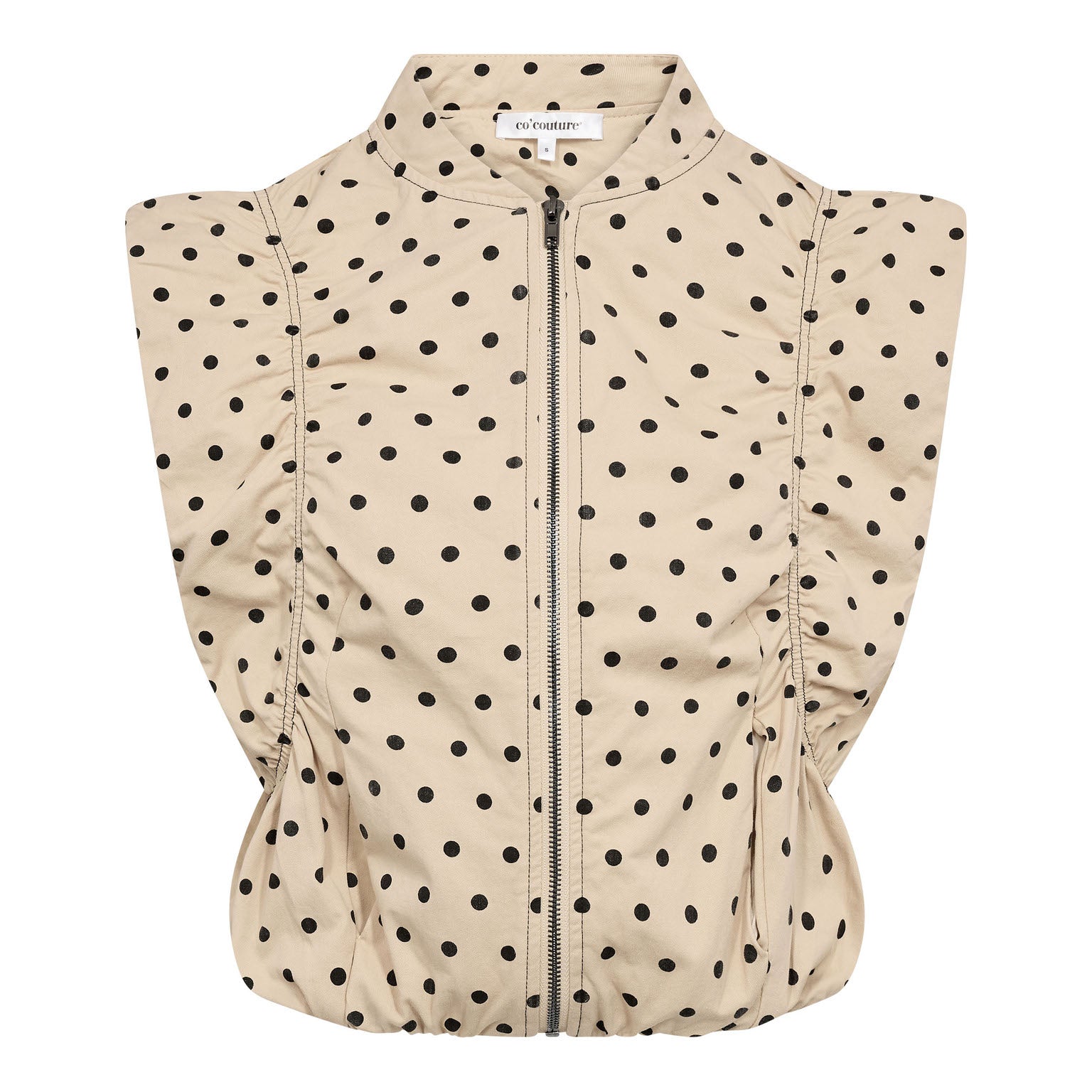 Denne vest har et moderne og iøjnefaldende udtryk med sit klassiske prikkede mønster i sort på en blød, beige bund. Den er designet med høj krave og gennemgående lynlås foran, hvilket giver et sporty og stilrent look.