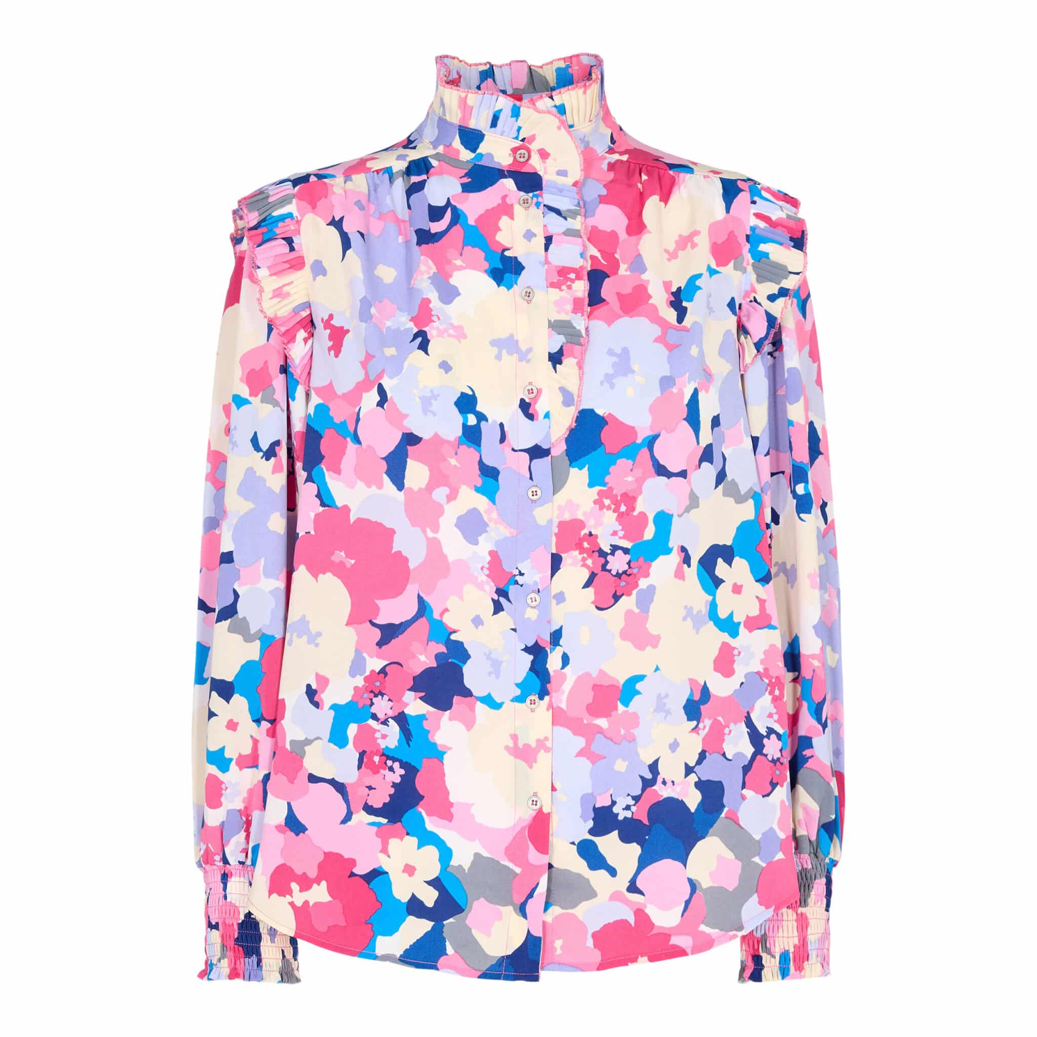 Smuk skjorte fra Co'Couture med lækre detaljer og fantastiske farver i abstrakt blomster print. Skjorten er gennemknappet og langs med åbningen øverst er der påsat en lille plisse flæsekant, som fortsætter rundt i halsen. Den samme kant er påsat skuldrene og giver skorten et flot udtryk. De lange ærmer har lidt vidde og afsluttes med en bred smock elastik.