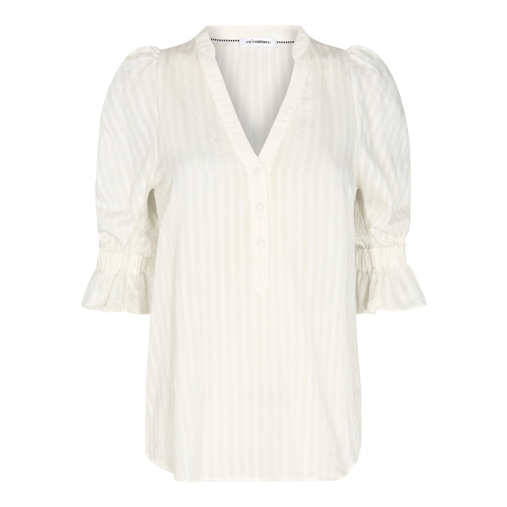 Smuk bluse fra Cocouture med v-udskæring, stofbetrukne knapper og ærme til ca albuen afsluttet med elastik-detalje. På Ærmer også en super cool detalje.