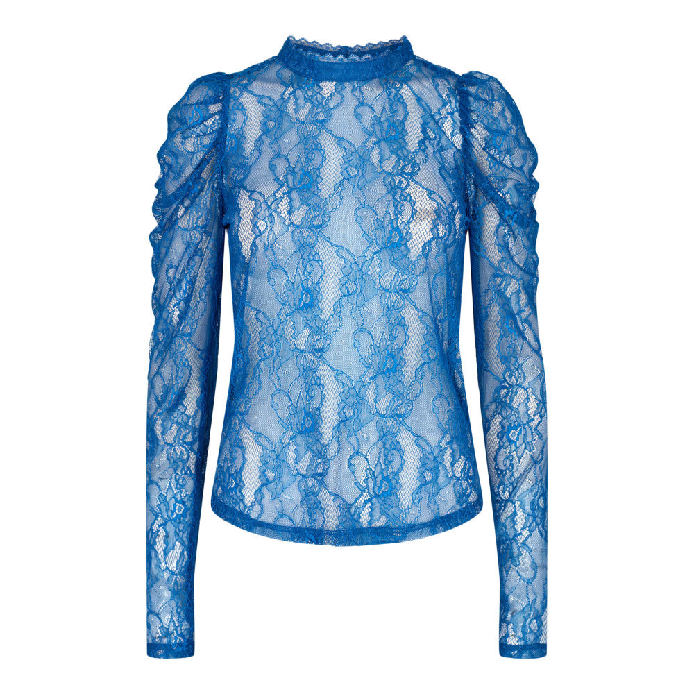 Smuk transparent blonde bluse i blå. Den har turtleneck med feminin blondekant og let drapering på skuldrene.
