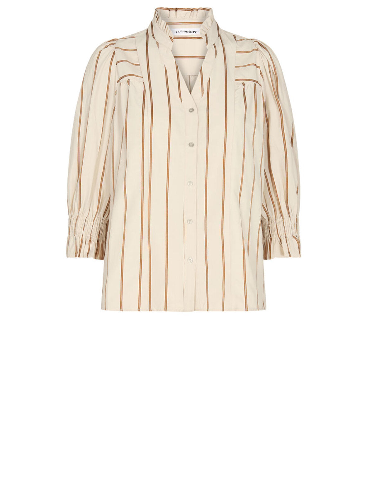 Skøn bluse fra CoCouture med sandfarvet bund og strip i mørk sand og hvid. Gennemknappet, med v-udskæring og flæse detalje i halsen. Med ærme til ca albue afsluttet med smock.