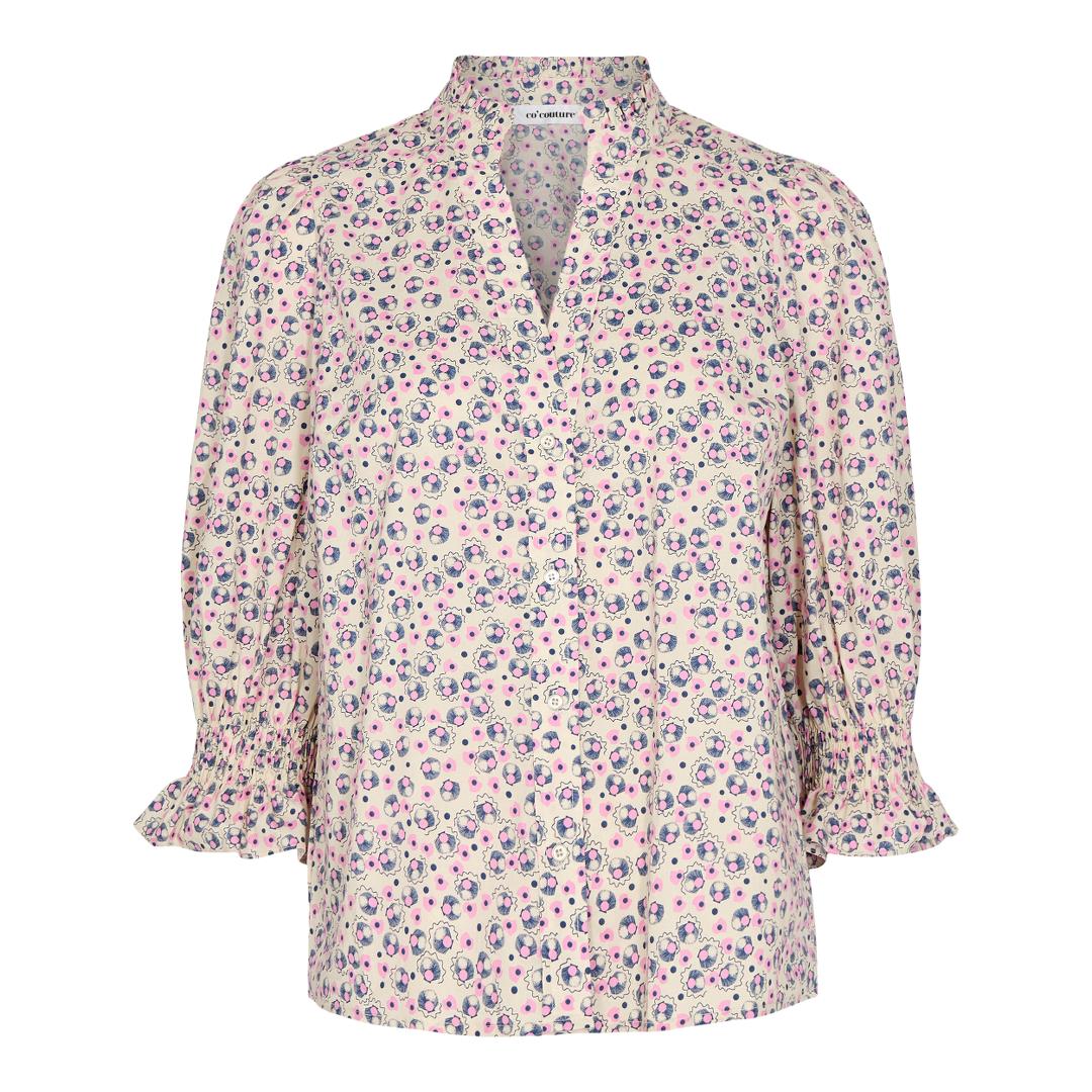 Sød bluse fra Co'Couture i off white med blåt og lyserødt print. Blusen har 7/8 ærmer som afsluttes med smock kant for enden. Blusen har v-udskæring og er gennemknappet.