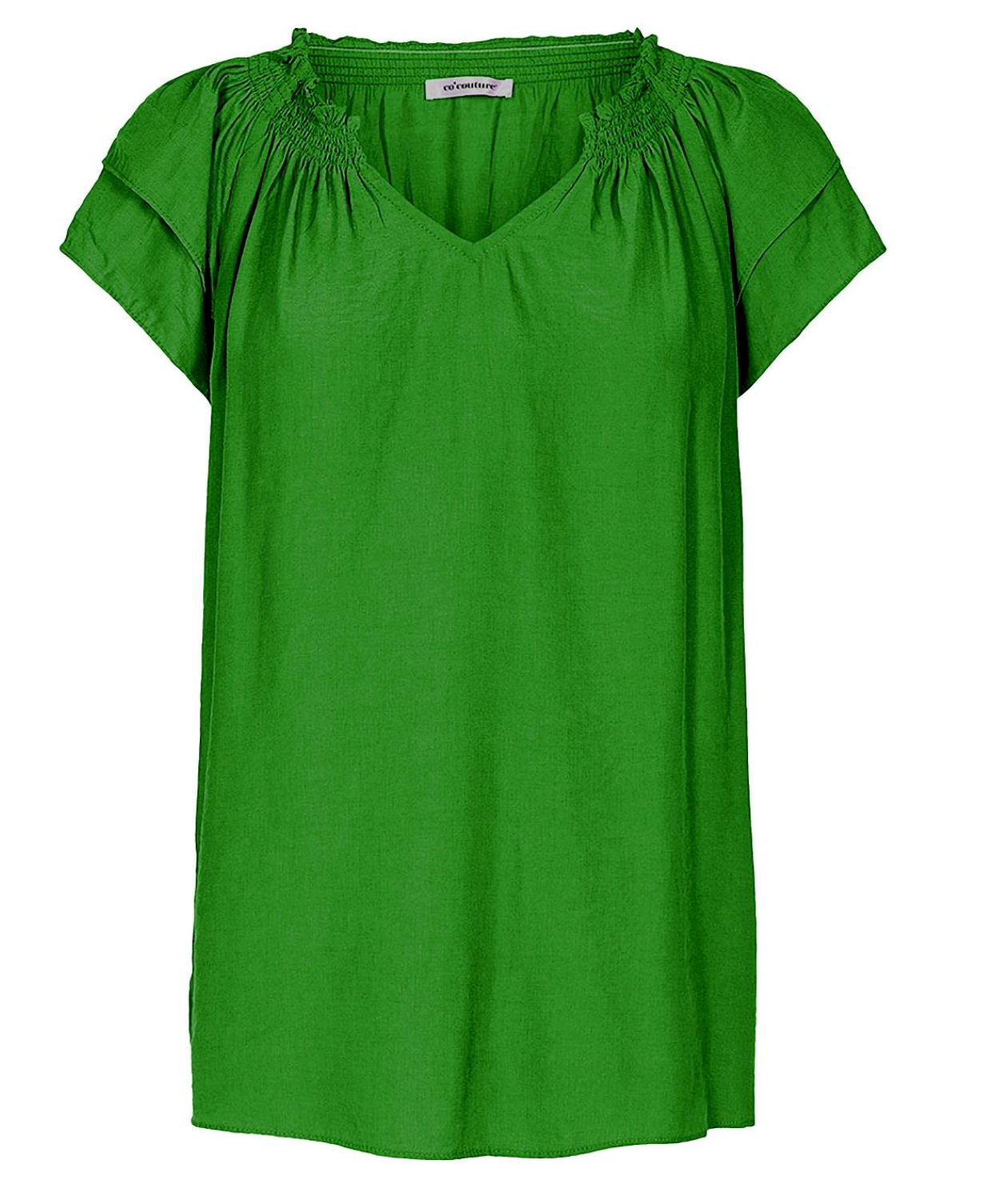 Smuk t-shirt fra Co'Couture. T-shirten har korte ærmer med flæser. T-shirten har elastik langs halsen og v-udskæring.