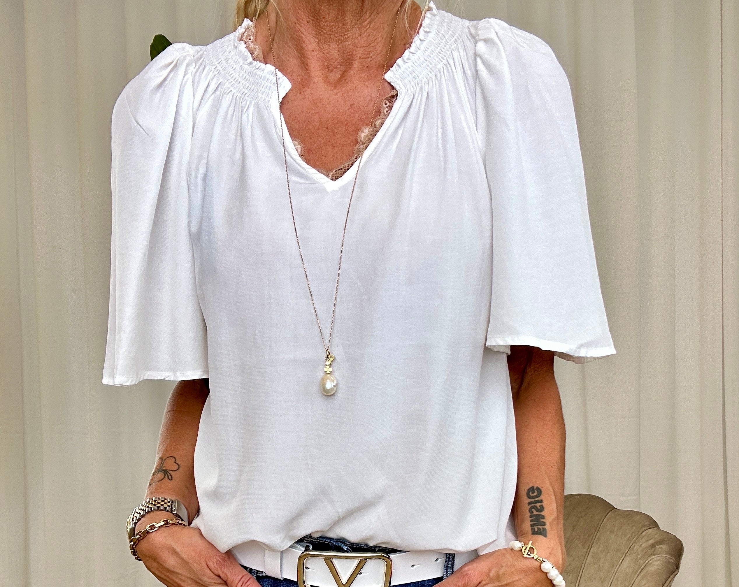 Den lækreste sommerbluse fra Co'Couture i klassisk creme hvid. Blusen har smock detaljer i kraven, en fin v-udskæring, samt en løs og luftig pasform.
