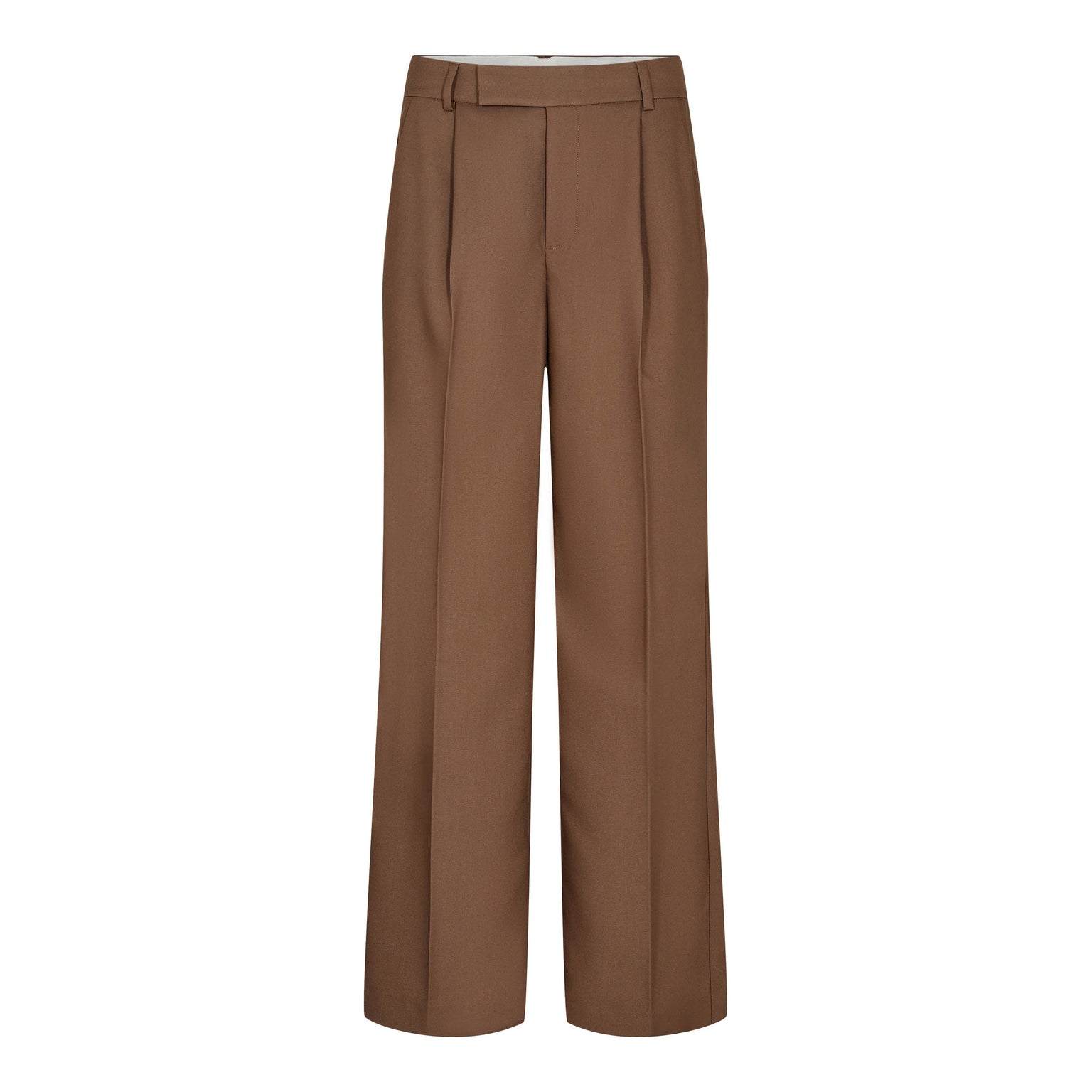 Cool bukser fra Co'Couture i en brun farve med lige ben. Der er to falske lommer bagpå og en lomme i hver side. Bukserne lukkes med knap og lynlås.