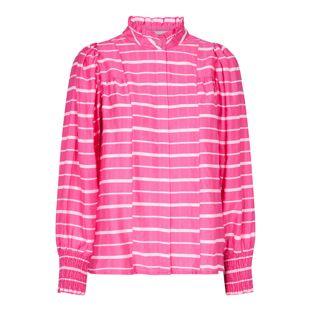 Super cool bluse med skjulte knapper hele vejen ned. Den. har lange ærmer afsluttet med smock og lille flæse i halsen.