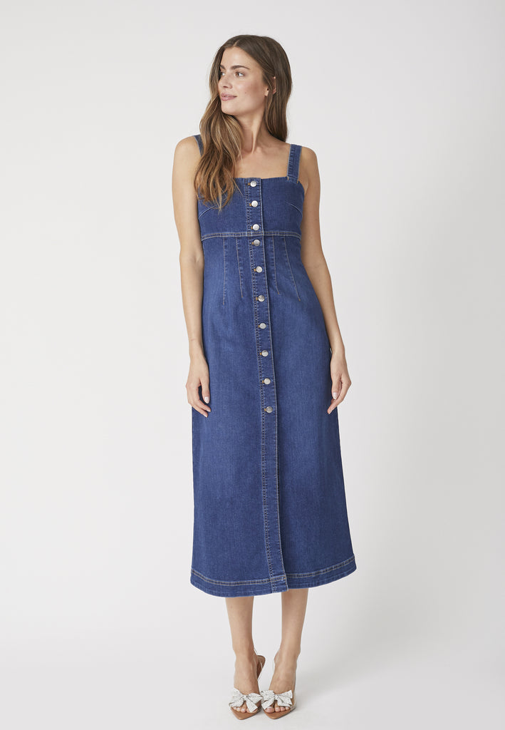 Co'Couture har leveret den smukkeste denim kjole med det helt perfekte snit! Kjolen har masser af stretch knapper ned til lige over knæet hvorefter der kommer en slids. Stropperne er regulerbare, og snittet under barmen fremhæver taljen med små indsyninger.