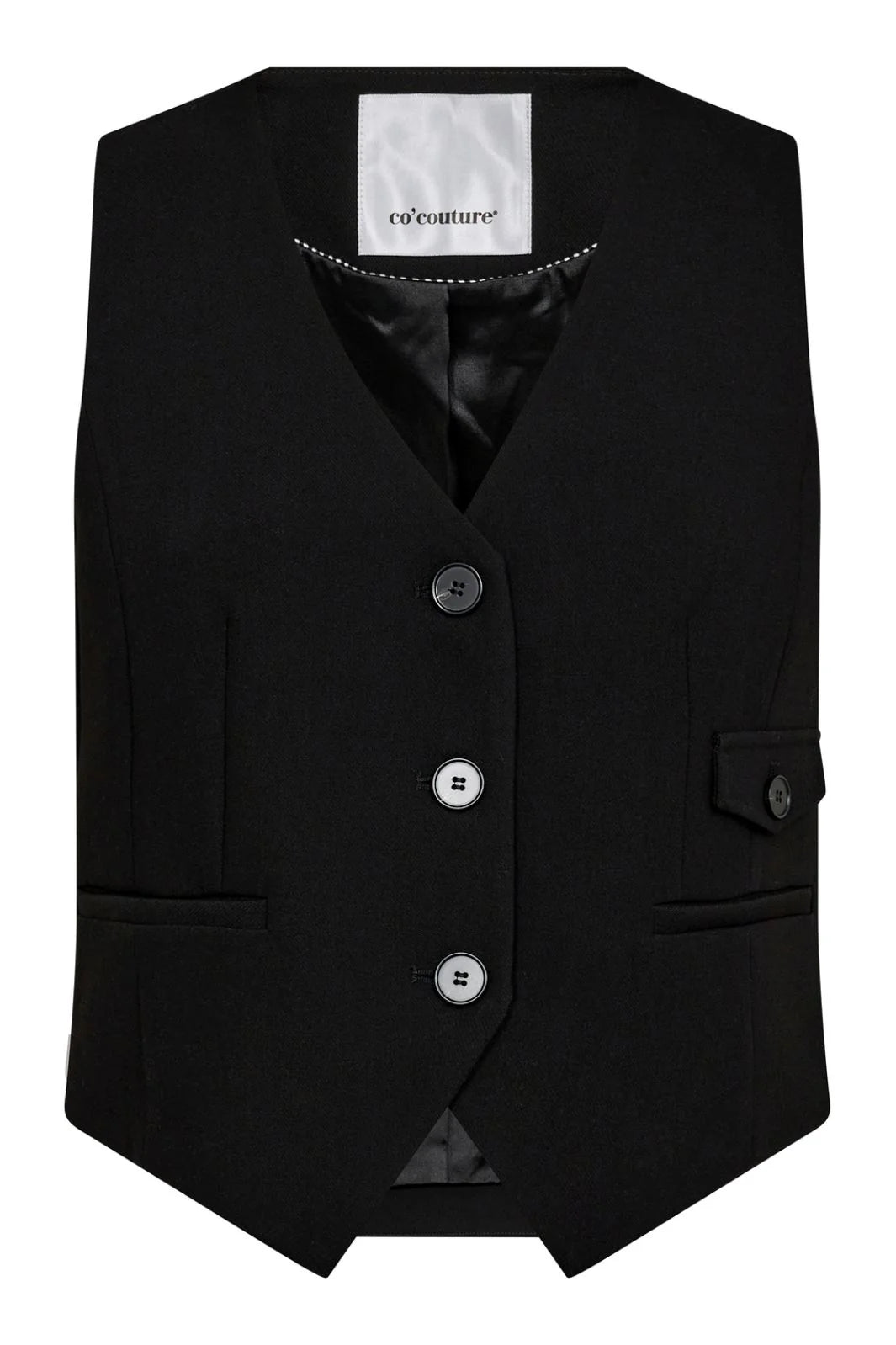 Enkel og elegant vest fra Co'Couture. Vesten har v-udskæring og kan knappes med tre knapper. Vesten er ærmeløs og har to gennemsyet lommer foran.