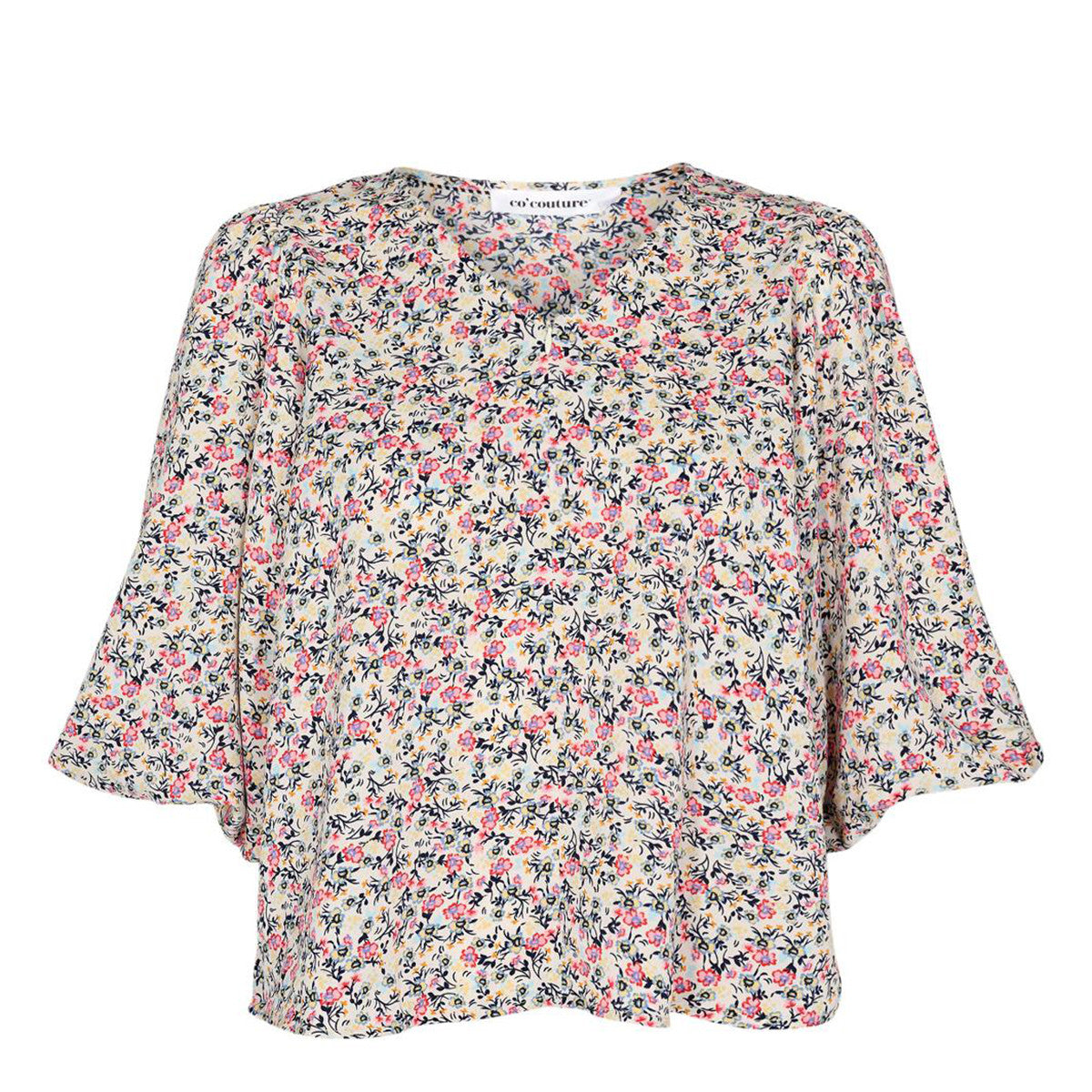 Skøn bluse med fint blomsterprint fra Co'couture. Blusen har v-hals med ca. 9 cm diskret lynlås. Ærmerne har masser af volumen og er afsluttede med elastik.