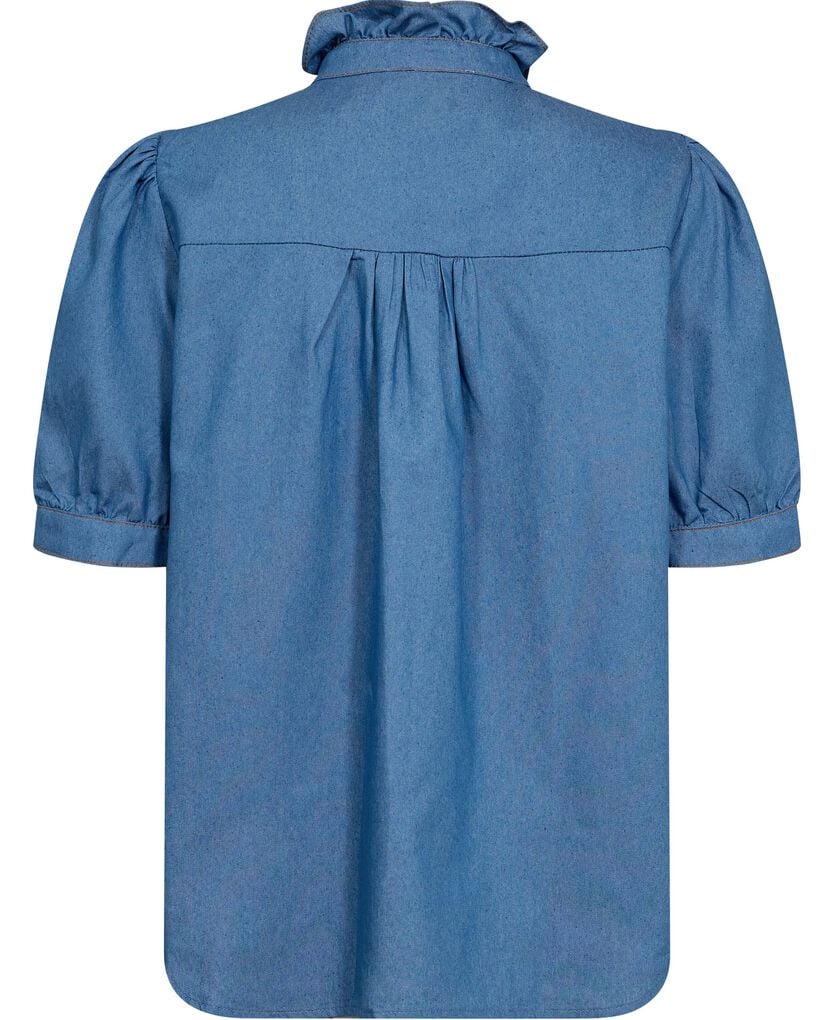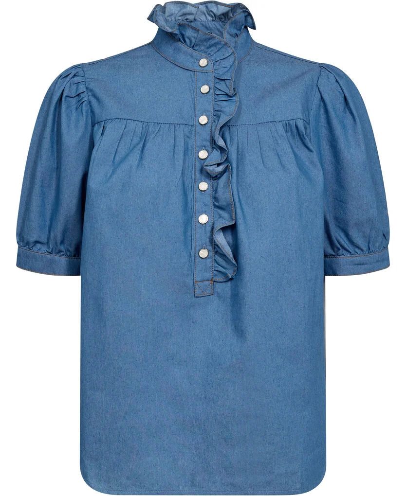 Blusen har en høj halsudskæring med flæser og elegante knapdetaljer foran, der tilføjer et sofistikeret touch. De korte pufærmer giver et romantisk og moderne udtryk, mens det lette denim-materiale sikrer komfort hele dagen. Denne bluse er en fantastisk tilføjelse til enhver garderobe, da den kan styles både op og ned alt efter anledningen.