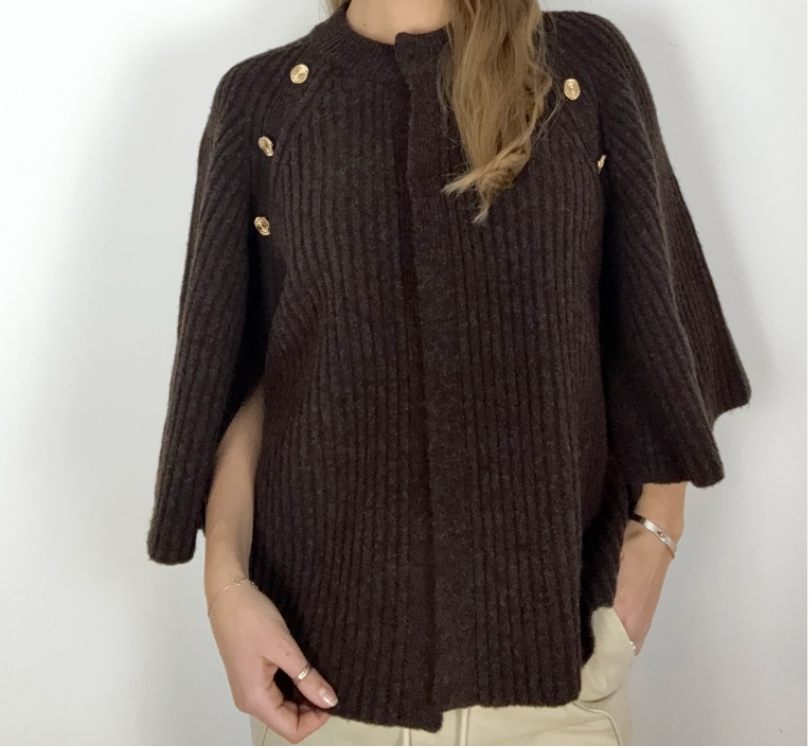 Kappen er i en varm, brun tone med løs pasform og 3/4 ærmer. Stoffet er en blanding af akryl, polyester, nylon og uld, hvilket giver den både blødhed, varme og en let struktur. Den har en rund halsudskæring og knapper ved skulderen — detaljer der giver et afslappet og moderne look. Designet er enkelt og stilrent, så kappen egner sig godt til hverdagsbrug — fx over en basis-top og jeans — men kan også styles til noget lidt mere elegant.