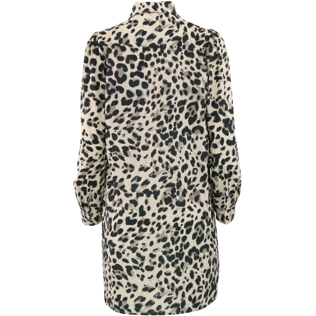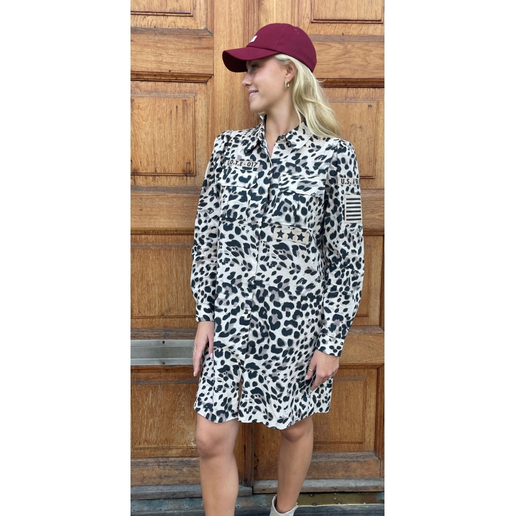 Så cool en skjortekjole fra Continue i et flot leopardprint. Kjolen har brystlommer fortil, krave med flipper og rå patches.
