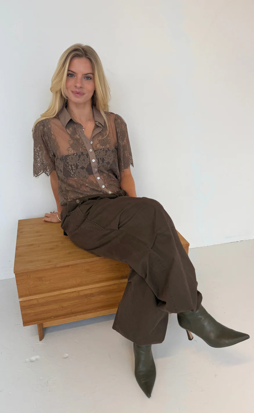Contunie har leveret den smukkeste blondebluse i en lækker karamel brun farve. Blusen har en løs pasform, t-shirt ærmer og rå blondekanter, og så har den en krave og er gennemknappet med fine perlemorsknapper.