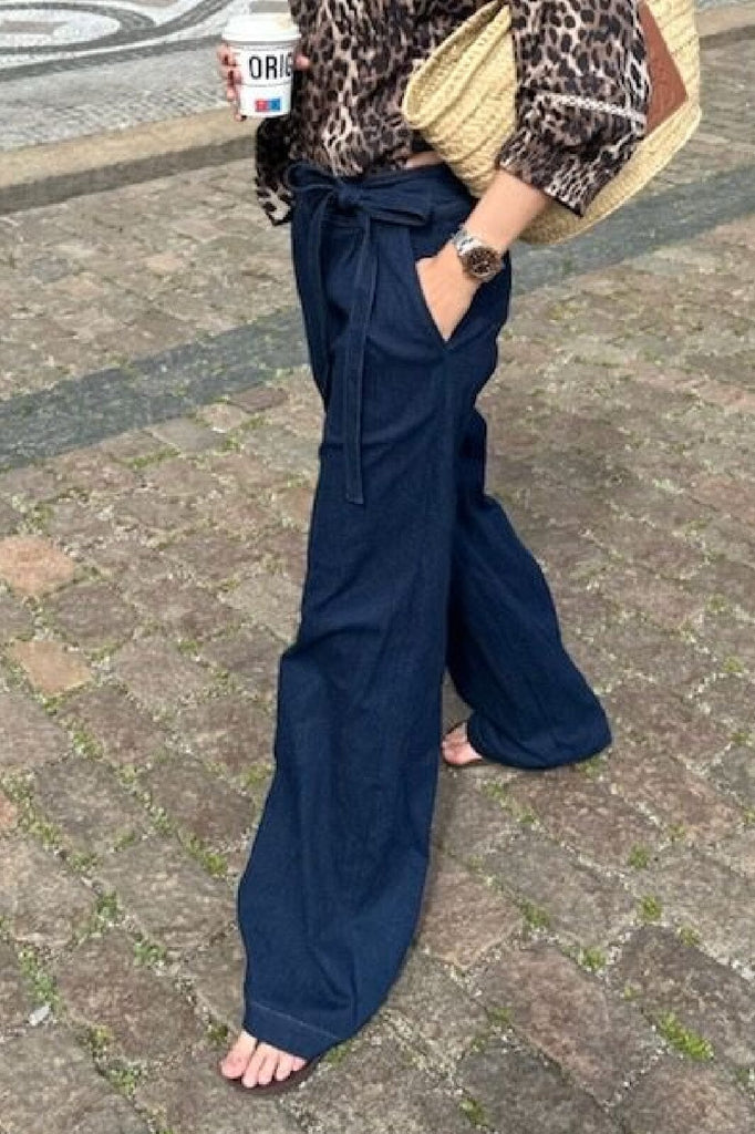Virkelig cool denim bukser fra Continue. Bukserne har et klassisk fit med en flatterende pasform og den fineste påsyet snørredetalje. Med skrålommer, læg fortil og vidde i benene.