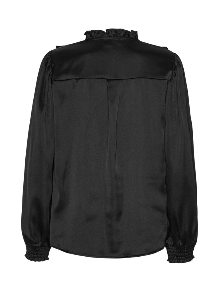 Smuk bluse i skinnende sort. Med guldknapper ned foran, flæse i halsen og ned foran. Afsluttet med blød elastik ved ærmer.