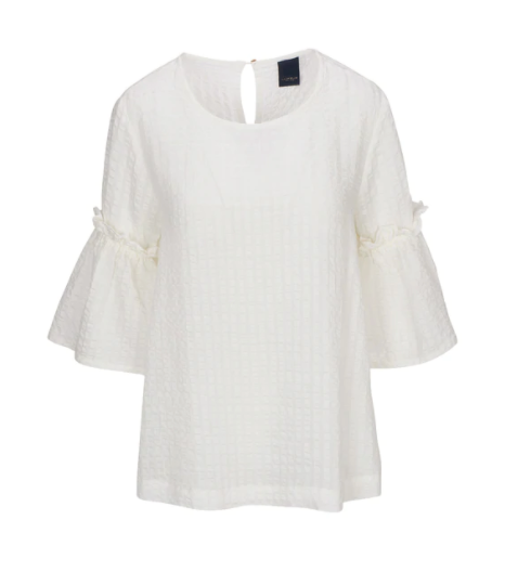 Utrolig sød bluse fra Luxzuz med trekvartlange ærmer der afsluttes med en bred flæse. Blusen har rund hals, der lukkes bag til med en lille slids og knap.