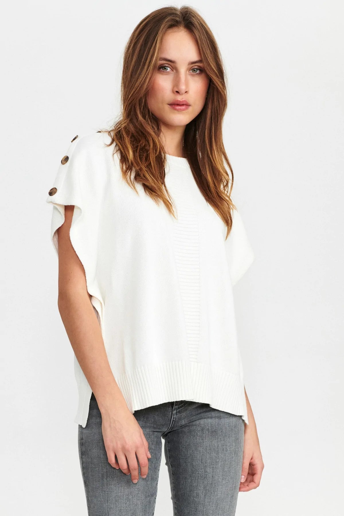 Super sej strikket vest med knapper på skuldrene. Vesten har rund hals, mønster detaljer ned midt på og slids i siden. Den er oversized i pasformen og længde underkant bagdel.
