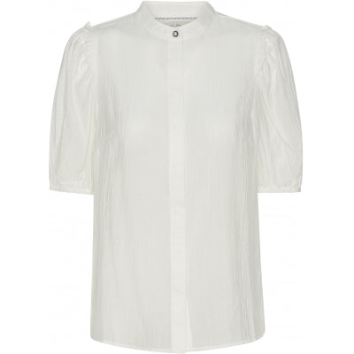 Smuk og elegant bluse med et fint feminint look og detaljer som den smukke knap i halsen. Blusen kan knappes op. Bemærk den fine flæse ved skulderen og de smukke ærmer med en smule puf. Kvaliteten er en smuk blød og let viskose.