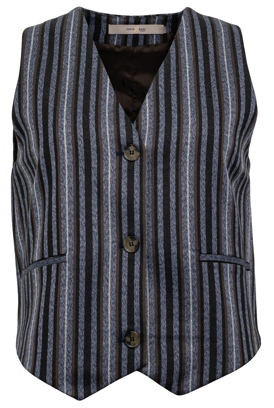 cool tailored vest fra Costamani i skønne striber. Vesten har paspolerede lommer fortil og lukkes med knapper.