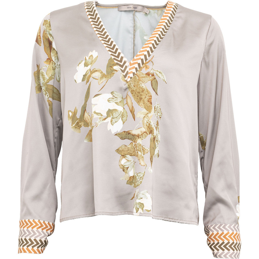 Skøn bluse fra Costamani i den lækreste viskosekvalitet. Kommer i en smuk sandfarve med fede grafiske detaljer. Blusen har v-udskæring og lange ærmer.