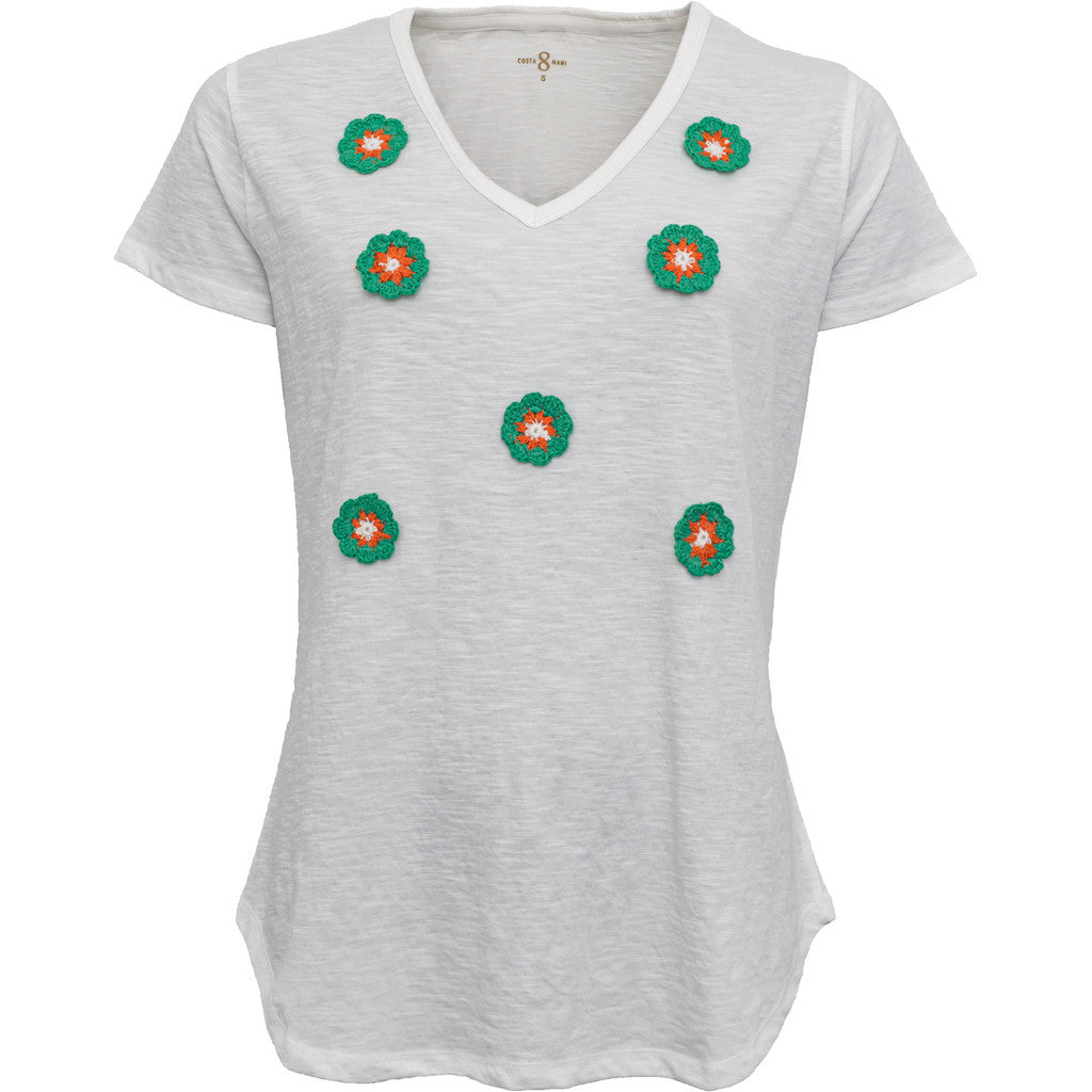 Skøn t-shirt fra Costamani i en blød bomuldsmix. T.shirten har v-udskæring og fine hæklede blomster i skønne farver.