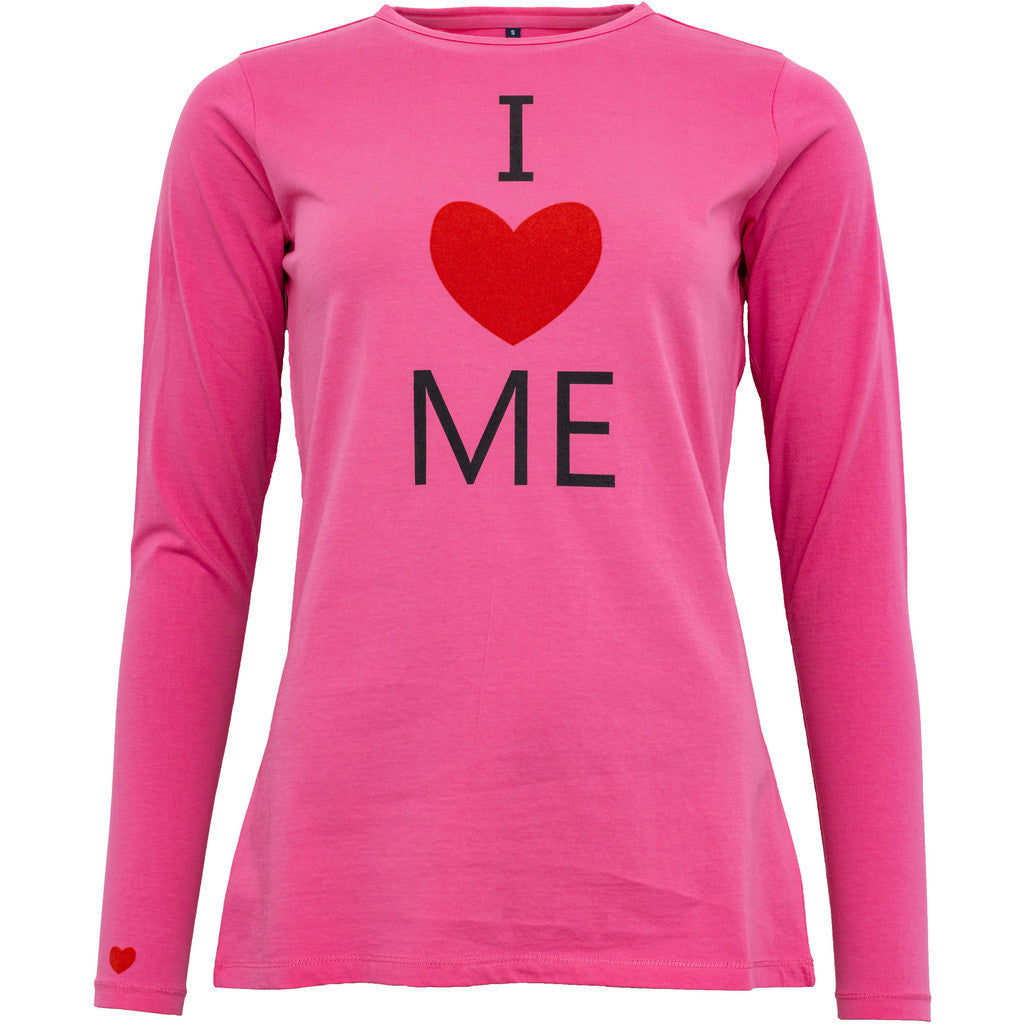 Lækker blød bomulds t-shirt med "I Love Me" tryk fra Costamani. Blusen er med lange ærmer, rund halsudskæring og hjerte i røde palietter fortil.