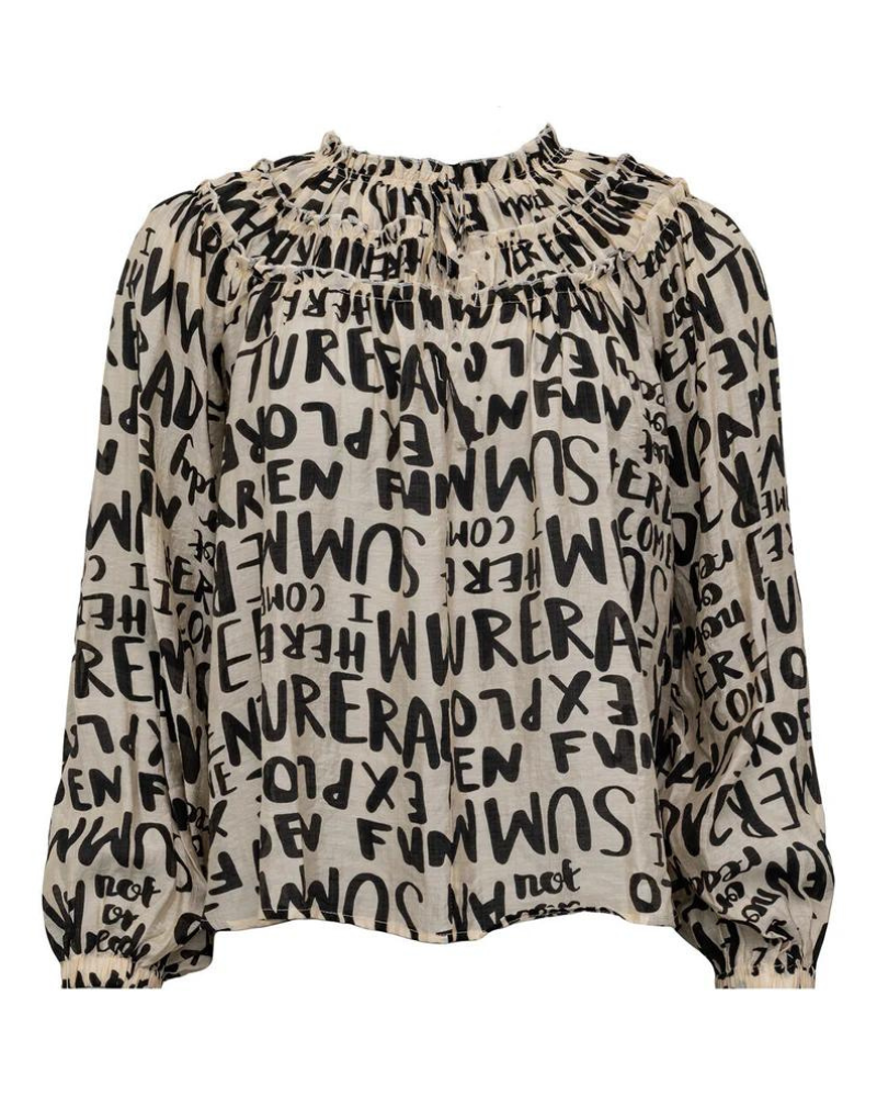 Fin og feminin langærmet bluse med flæse ved halsen, elastik ved ærmekanten og flot sort allover print. Brug den til et par lækre jeans eller bukser.