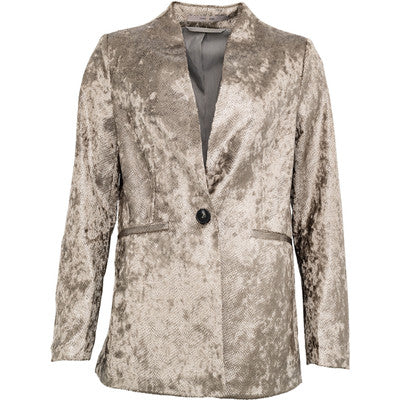 Cool kblazer fra Costamani i en flot skinnende army farve. Materialet er i en form for shiny velour med slange mønster.