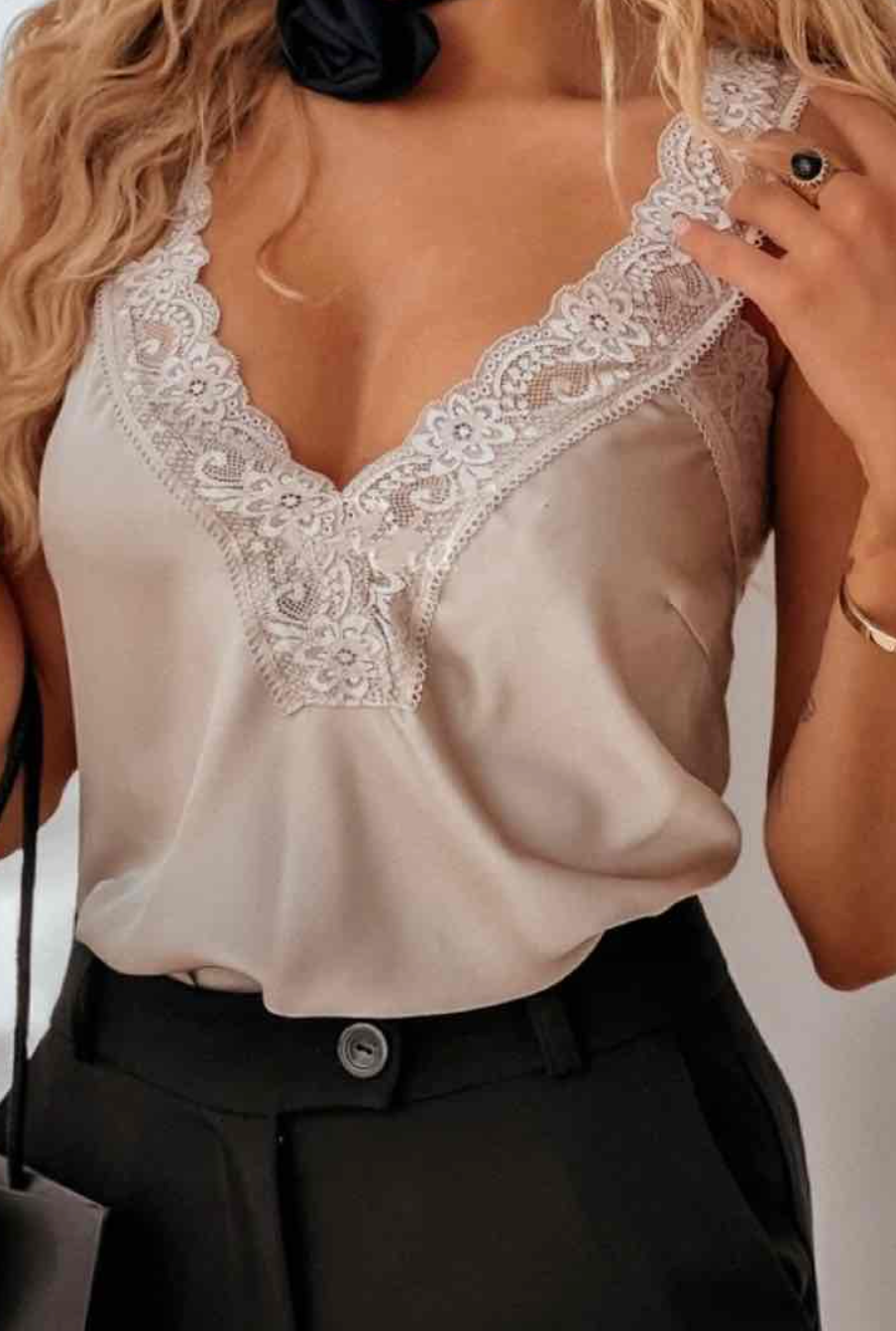 Flotte toppe fra Emsig Exclusive med v-udskæring og blonde. Pasform er løs og pakken indeholde en sort og en beige top.